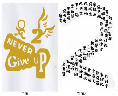 正面的“NEVER GIVE UP”意为“永不放弃”,在这有两层意思:第一是我们在学习生活中遇到困难不会放弃,执着追求真理;第二是在以后人生中遇到挫折磨难会努力克服,坚强面对。背面的“2”由集体师生的名字构成,象征2班团结友爱。