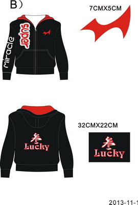 校运设计的班服设计为运动型外套。选取比较沉稳的黑色为主色调,同时凸显红色、白色,给人温暖希望,沉稳但不乏积极、活跃.红色阿拉伯数字3代表着3班,也象征着热血的我们追逐着闪电一般的梦想;“super”是我们追求的目标。繁体“叁”既是班级的标志,也与英文“lucky”相互映衬。