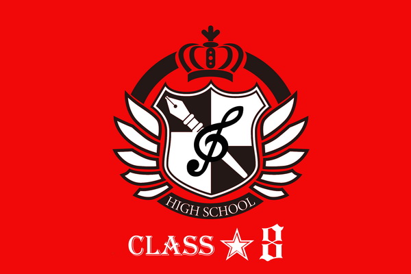以黑色和黄色为主,四周由绚烂多姿的花组成。班徽主体形状像一个竖琴,琴身围绕一条蛇,其嘴巴叼着铅笔屑(寓意为音乐生和美术生;竖琴中间由一个钟表组成,意味着初三是一个黄金时间,需争分夺秒。琴右下角是单词“king“,意为我们定能在运动场上,考试场上成为当之无愧的王者。